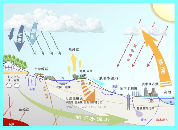 海水は蒸発して水蒸気になり、さらにはとなって陸地の上空へ移動する。そこで降水となった水は河川を流れ、再び海水にもどる。このように、地球表層の水はからのエネルギーをもとに循環している。