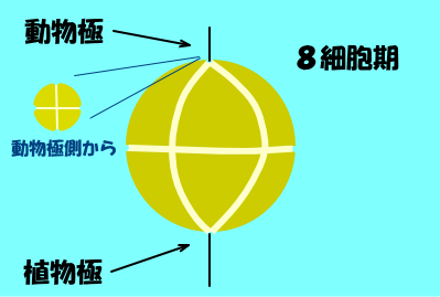 卵(不等割タイプ):卵黄は多く極側に偏っている.割.細胞期以降は動物極側と植物極側での大きさに差が出る.