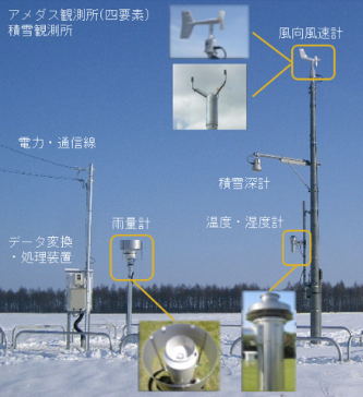 (AMeDAS):気象庁の地域気象観測システム.全国にか所以上の観測地点を設置し,測定した気象要素を中央に送信して集計したデータをスーパーコンピューターで分析し,に活用している.以前はひまわりの観測データから気象予測をしていたが,50%くらいしか当たらず,アメダスが1000か所に増えた頃からアメダスのデータを本格的に活用するようになり,気象予測の当たる確率が%に増えた.