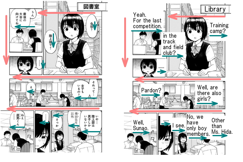 日本のマンガ本ではページやコマ,そして日本語の縦書きの文字は